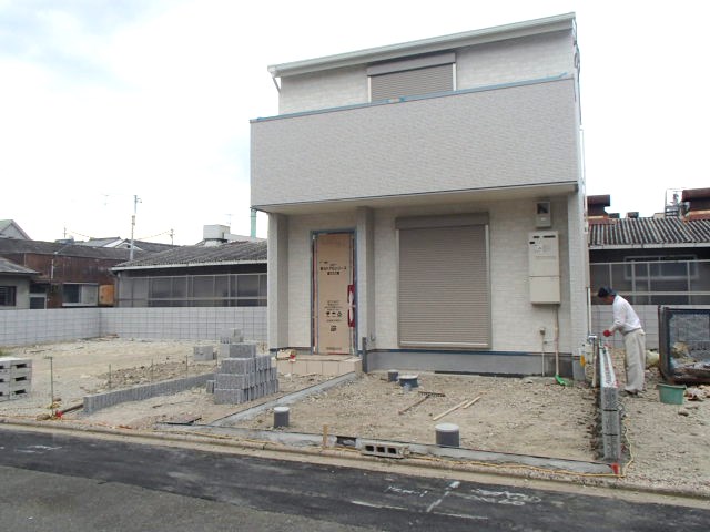 外構工事中です。ブロックを積む作業を行っています。