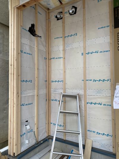 内部造作工事、ユニットバス設置、通気胴縁施工しています。